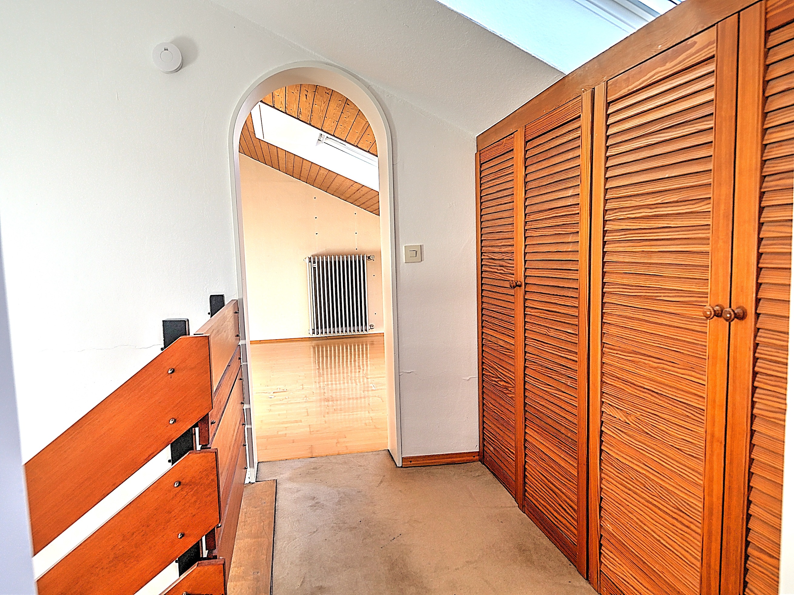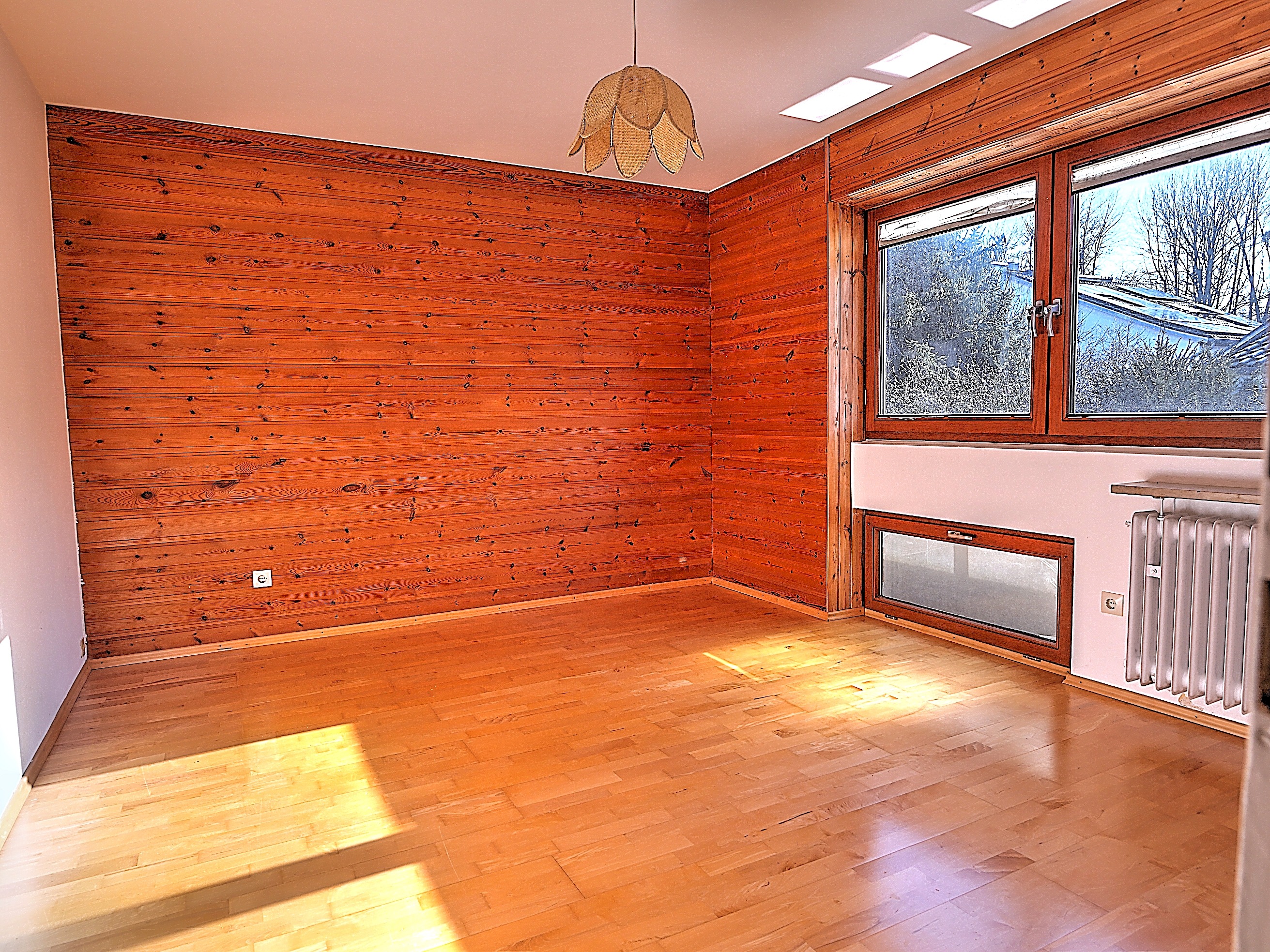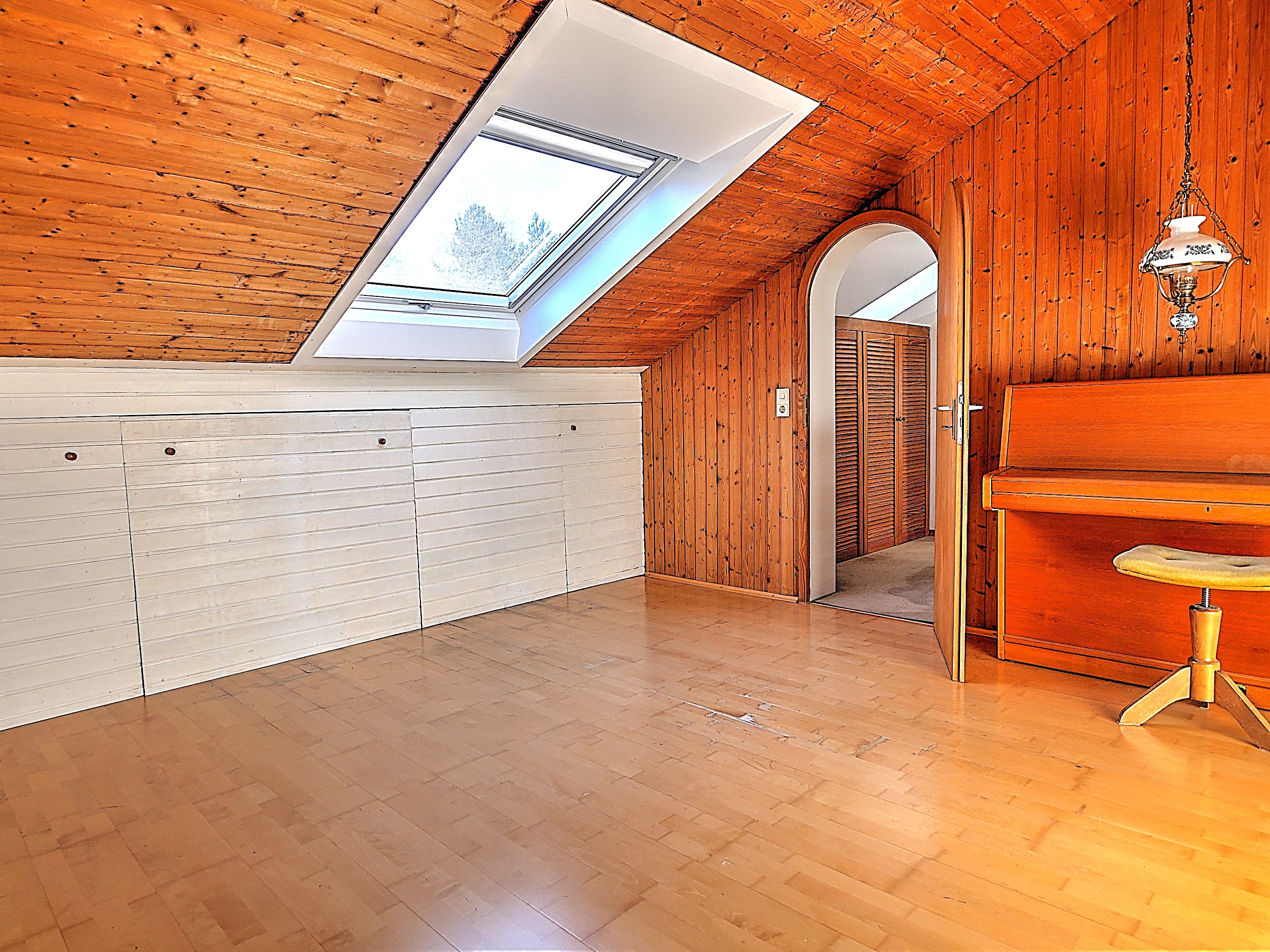 Im Obergeschoss befinden sich zwei Kinderzimmer mit holzverkleideten Wänden, ein Schlafzimmer sowie ein familienfreundliches Badezimmer mit Dusche, Badewanne und Fenster. Das Dachgeschoss wurde zusätzlich ausgebaut und bietet ein weiteres Zimmer sowie ein separates Duschbad. Die hier verbauten Velux-Dachfenster wurden bereits erneuert und sorgen für ausreichend Tageslicht.