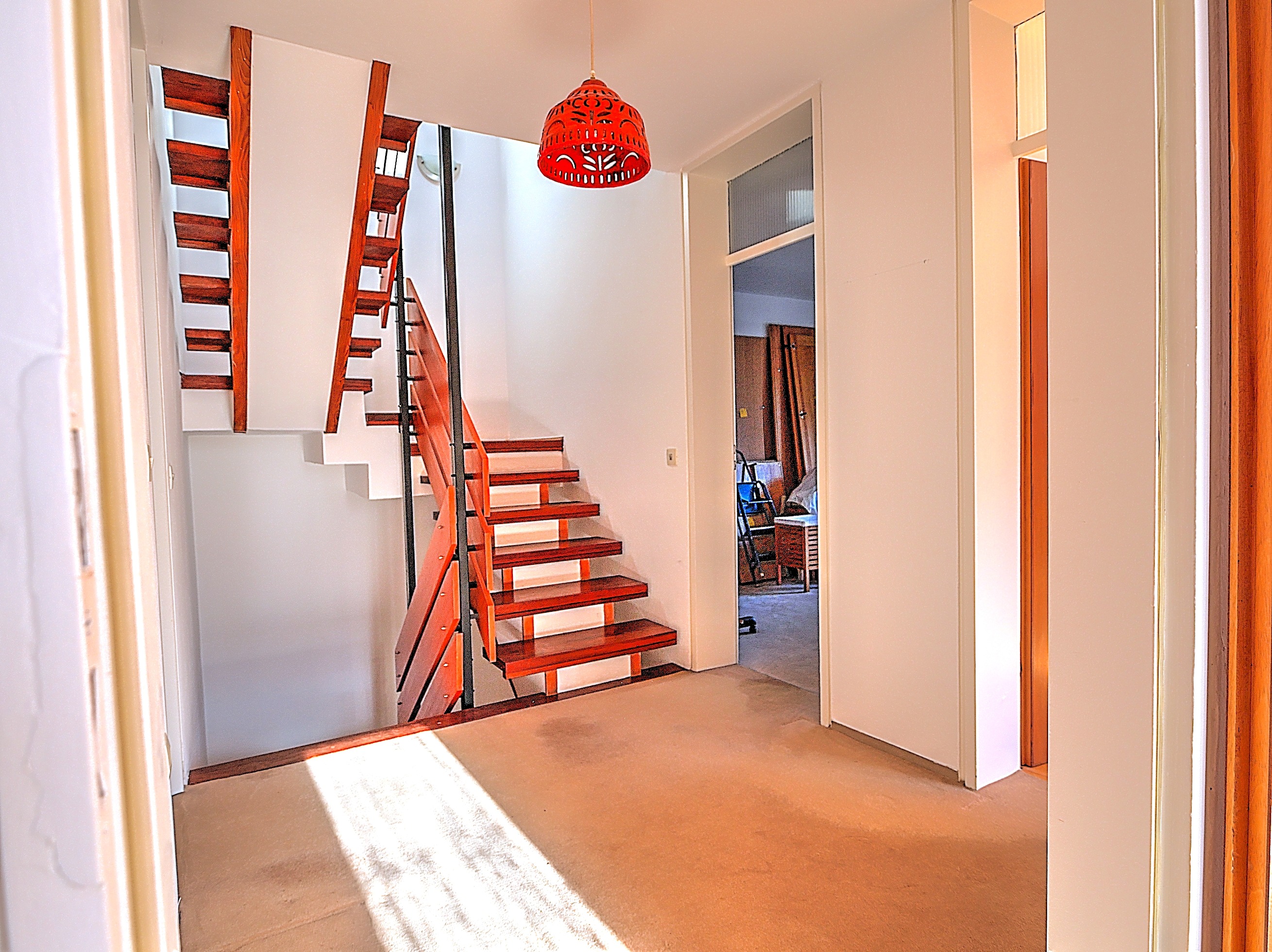 Das Wohnzimmer besticht durch seine angenehme Größe sowie verschiedene, teils maßgefertigte Holzeinbauten, die dem Raum eine warme und wohnliche Atmosphäre verleihen. Von der Essdiele aus führt die Treppe in die oberen Etagen des Hauses.