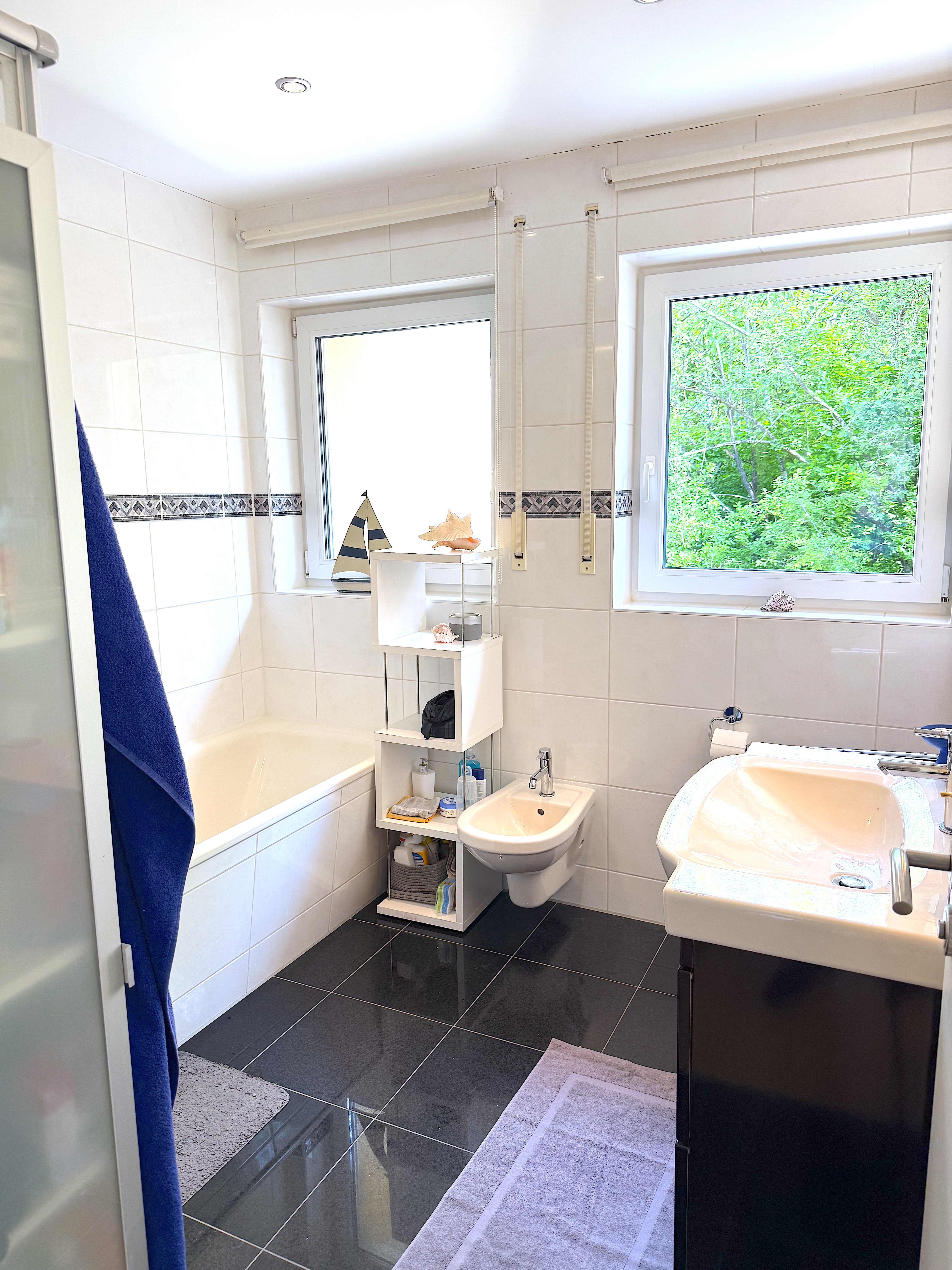 - Ausstattung des Bades Badewanne, Bidet, Dusche, Fenster