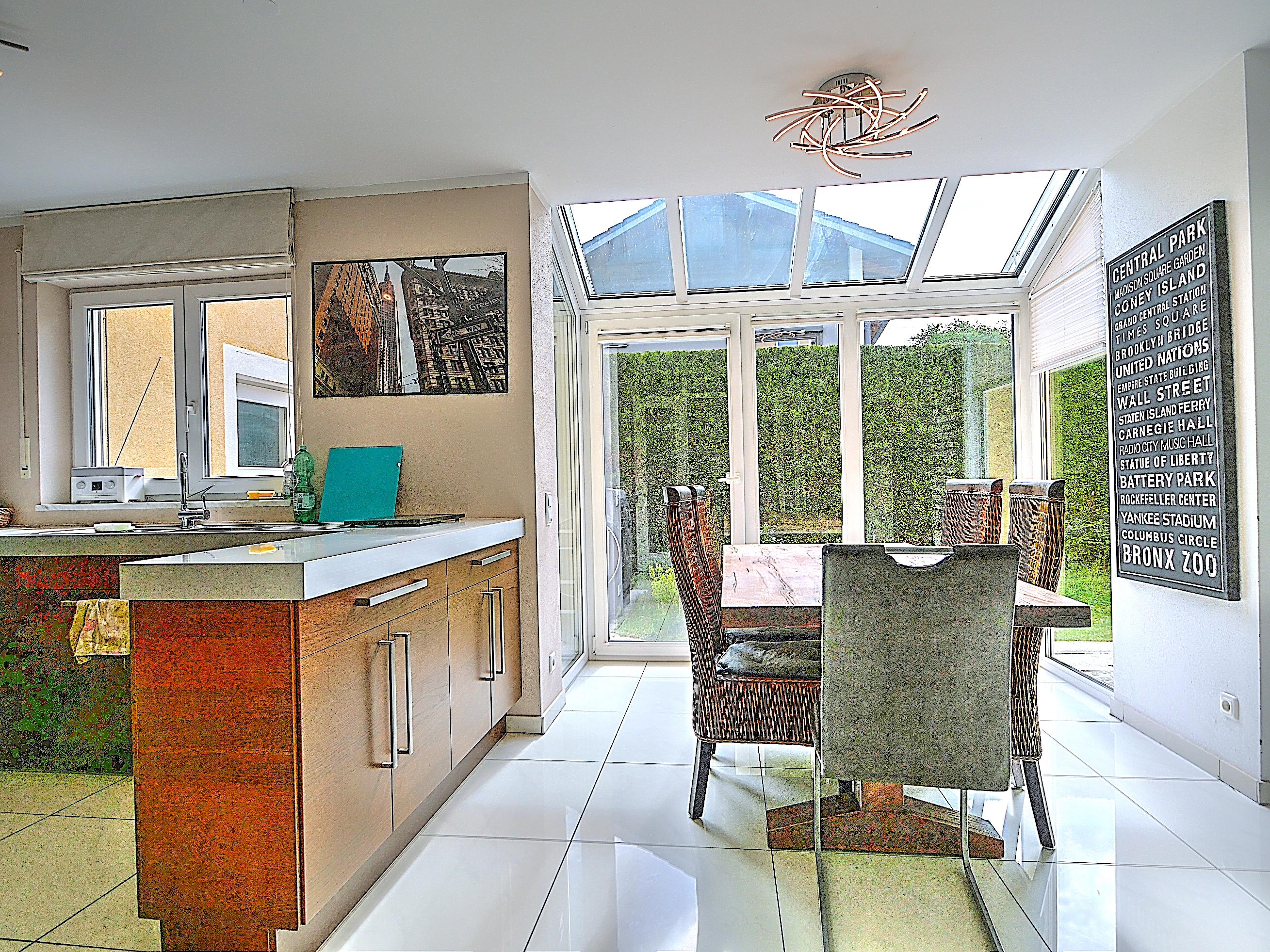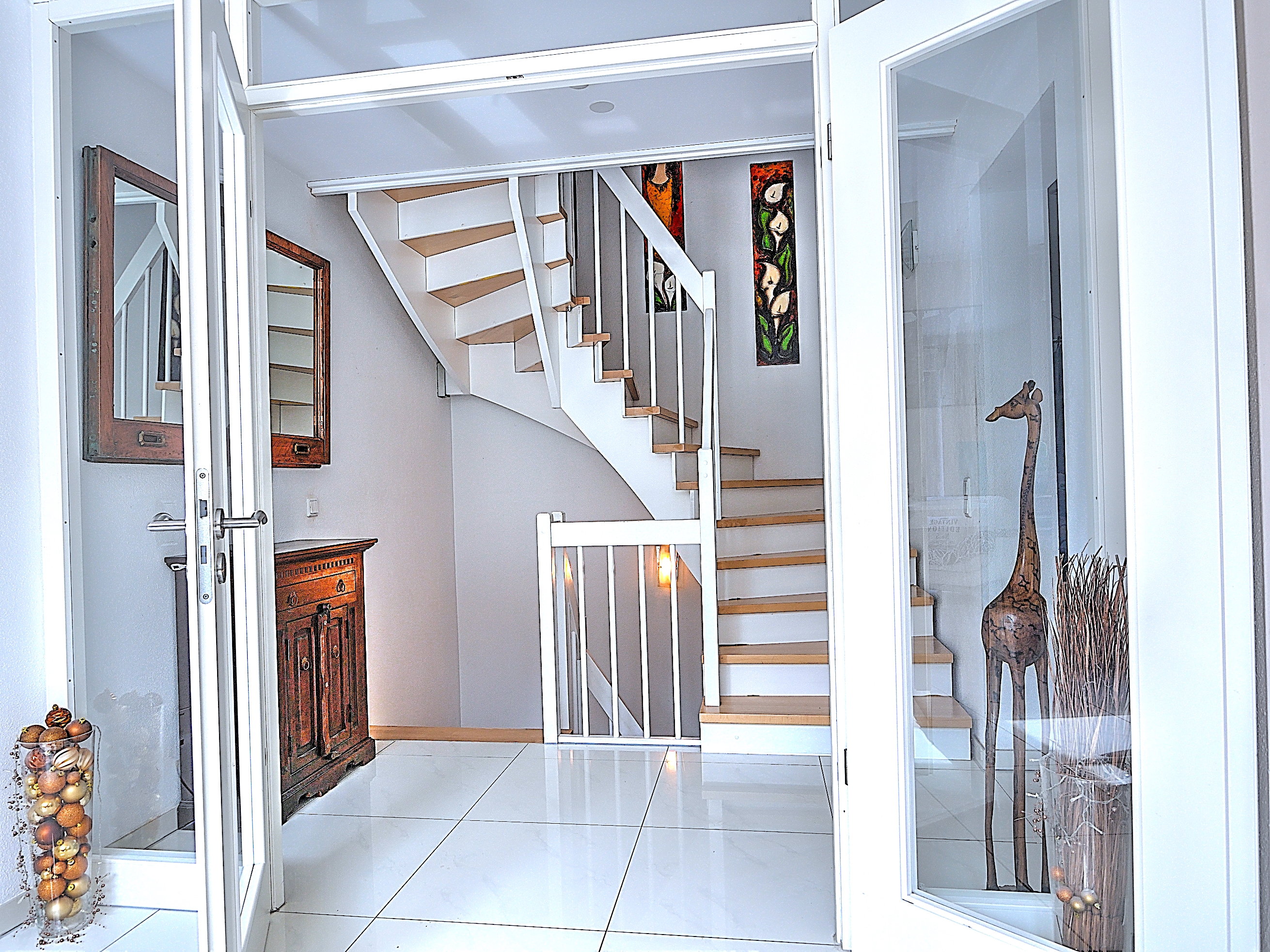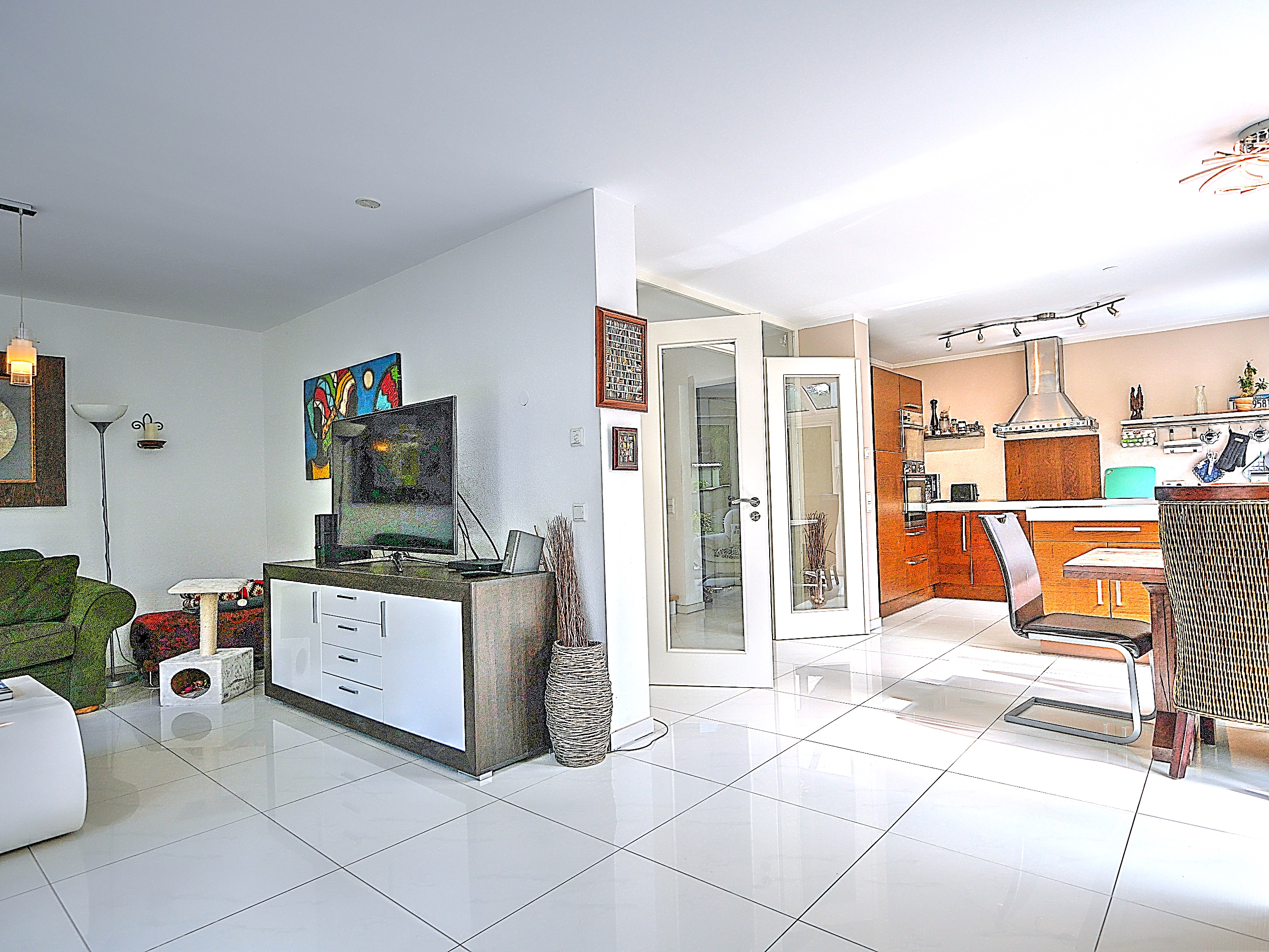 Im Inneren überzeugt insbesondere der helle, offene Wohn-/Essbereich mit integrierter Küche, ergänzt durch eine stilvolle Flügeltür mit Glaseinsatz zum Treppenhaus. Im Erdgeschoss befindet sich zudem ein Gäste-WC.