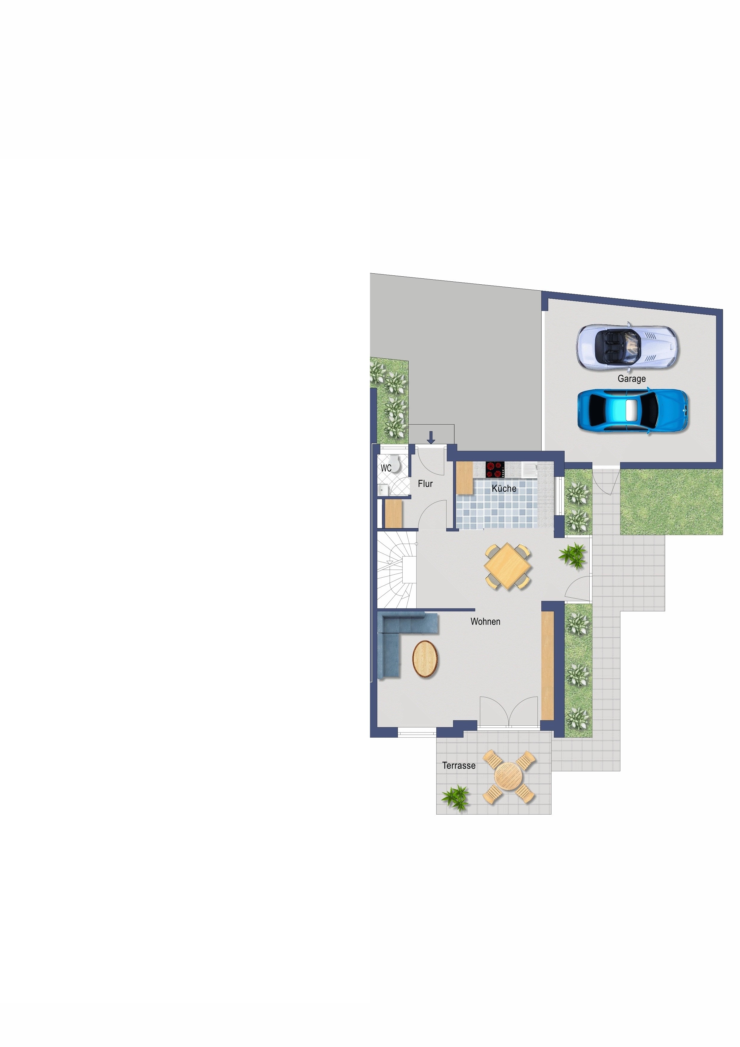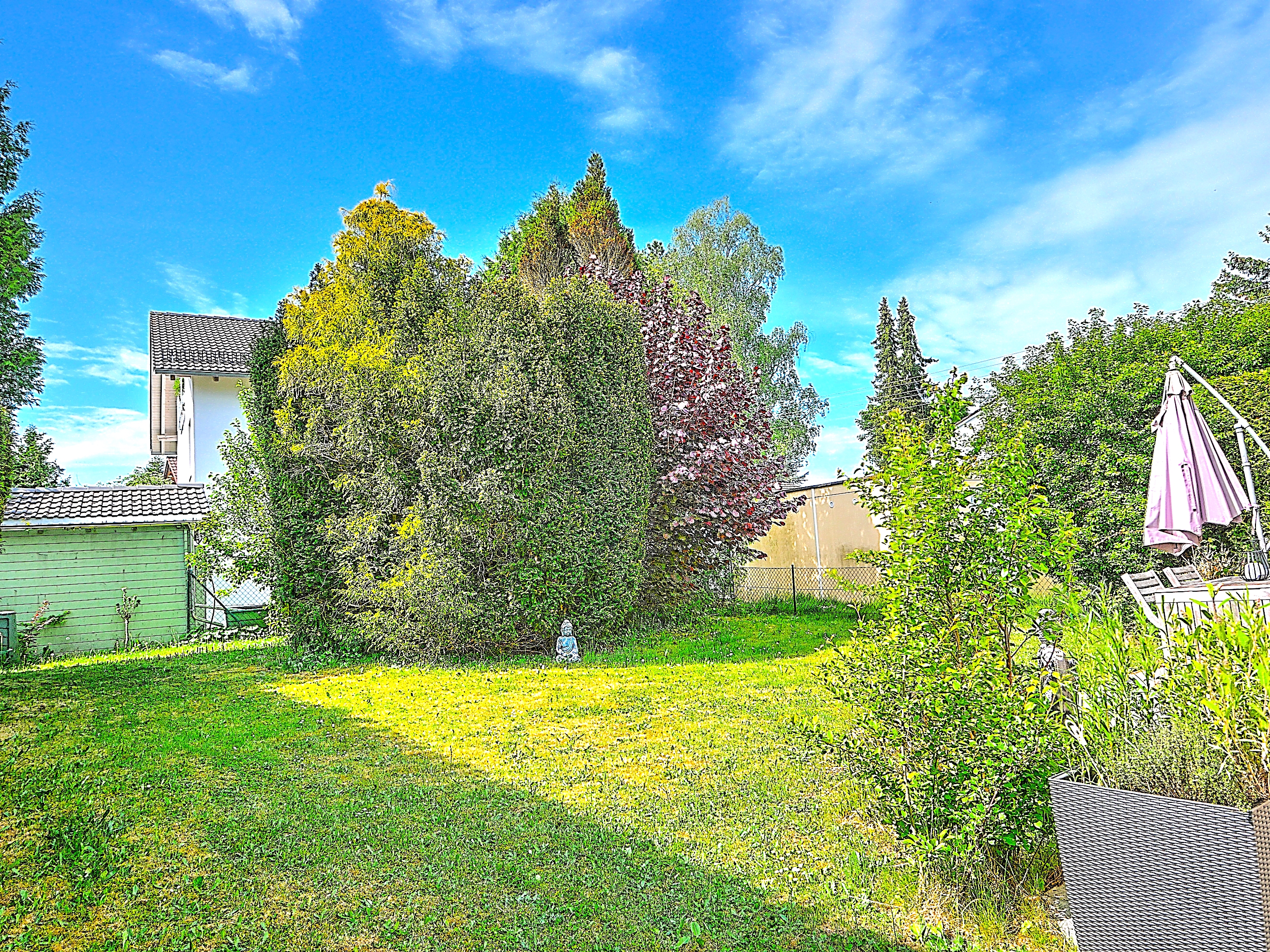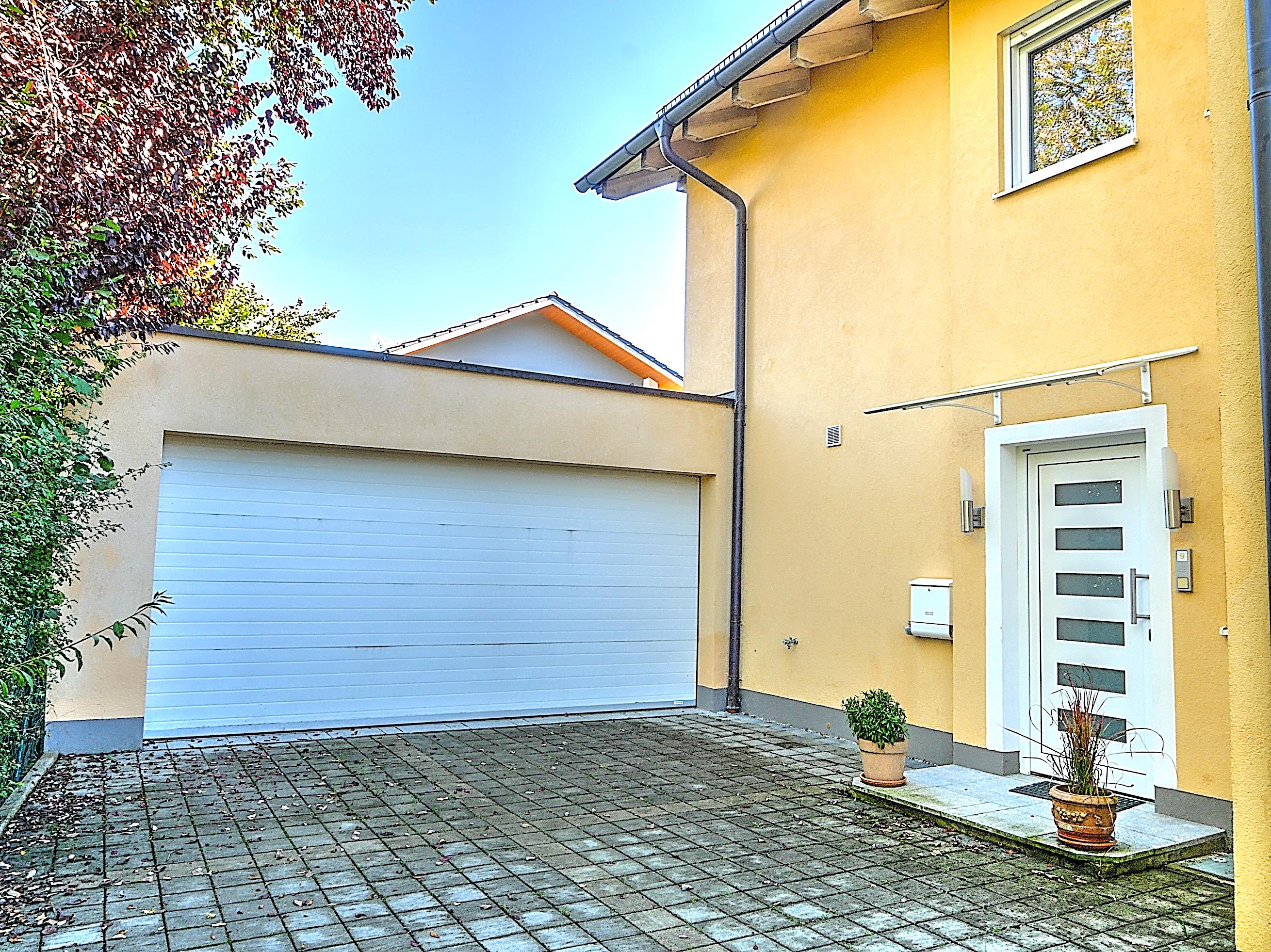 Die Zufahrt zur zurückversetzt gelegenen Doppelhaushälfte erfolgt über ein gemeinschaftlich genutztes Wegerecht. Die großzügige Garage ist mit einem elektrischen Torantrieb ausgestattet.