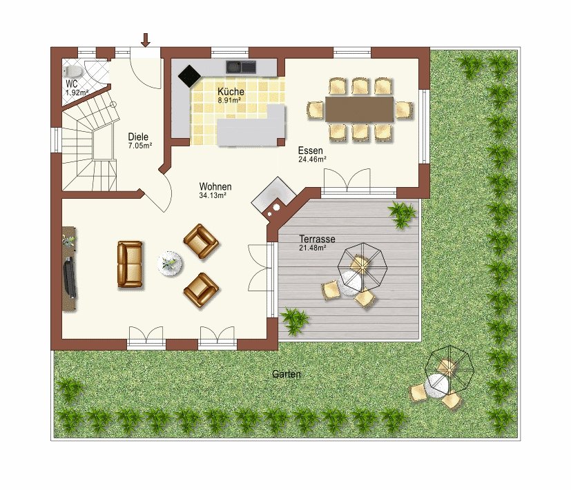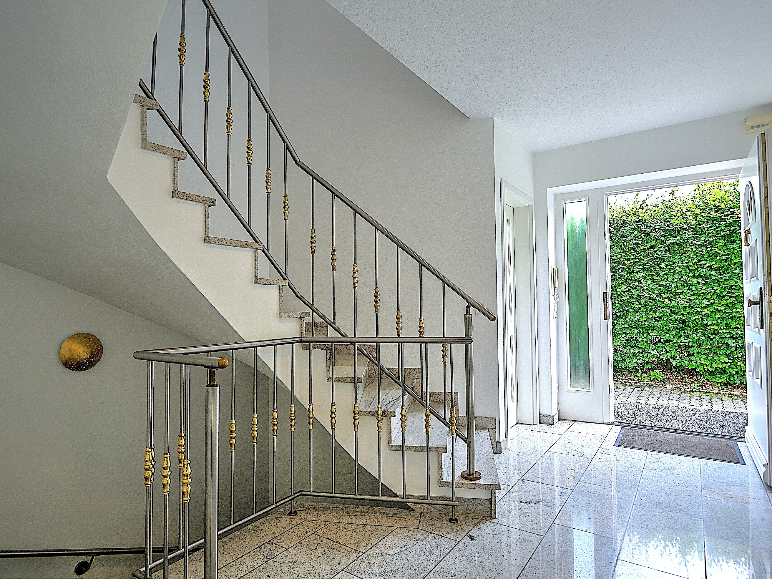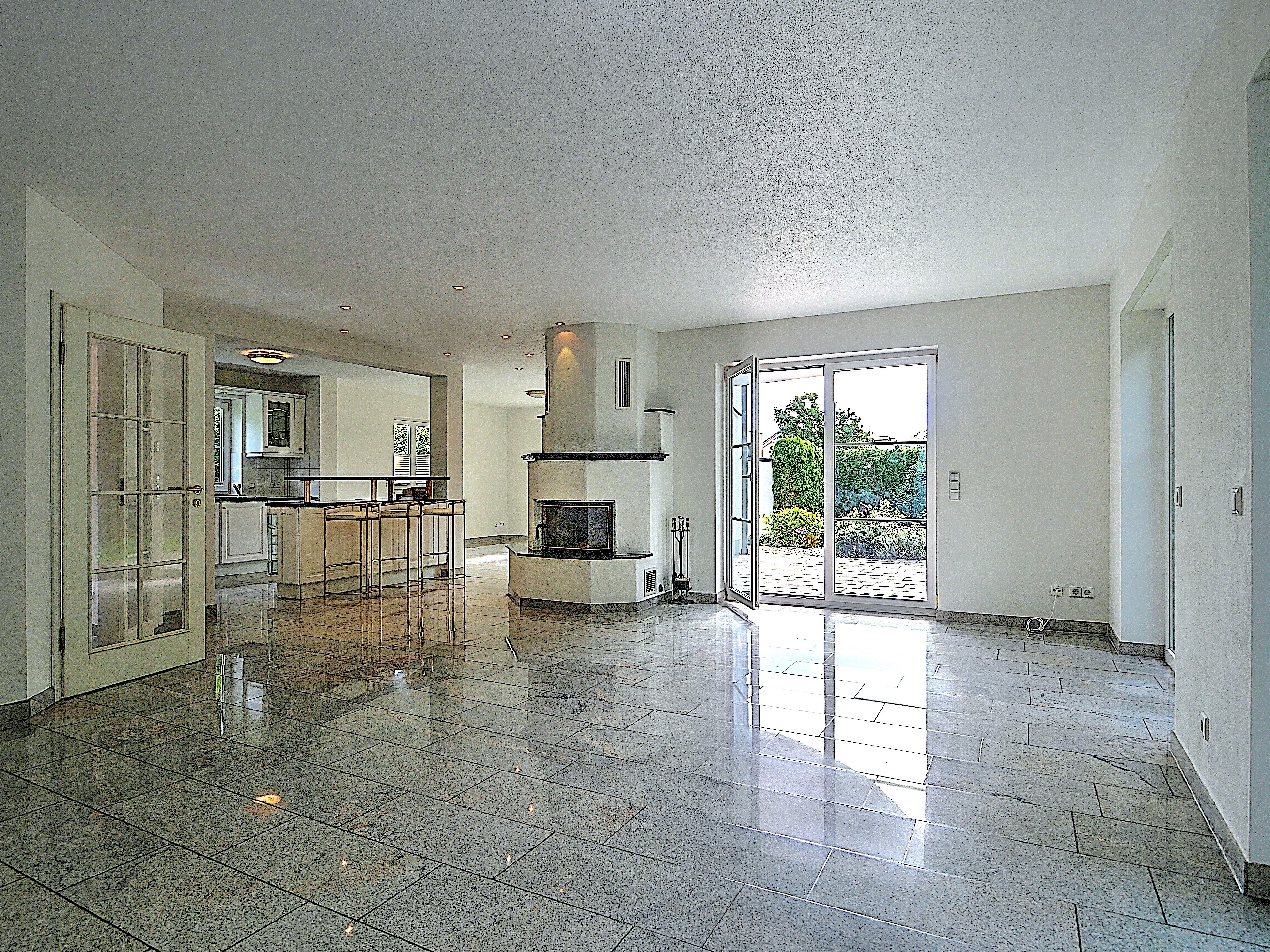 Das Haus präsentiert sich mit hochwertigen Granitböden und Fußbodenheizung im gesamten Gebäude. Mittelpunkt des Erdgeschosses ist der großzügige Wohn- und Essbereich mit offener Küche samt Theke und einem gemütlichen Kamin. Von hier aus gelangen Sie direkt auf die großzügige, nach Südosten ausgerichtete Sonnenterrasse mit Blick in den gepflegten Garten. Ein Gäste-WC ergänzt das Raumangebot auf dieser Ebene.