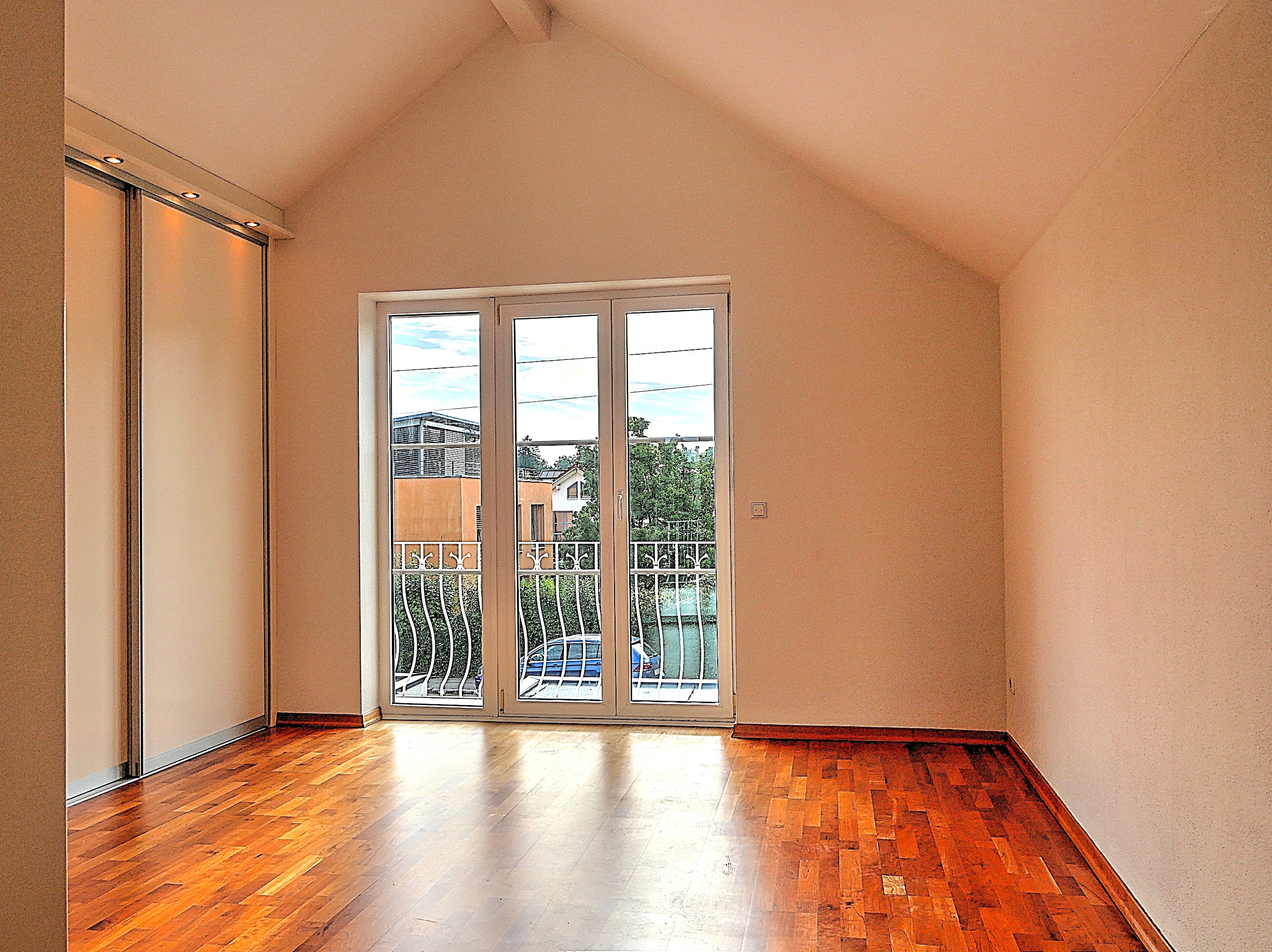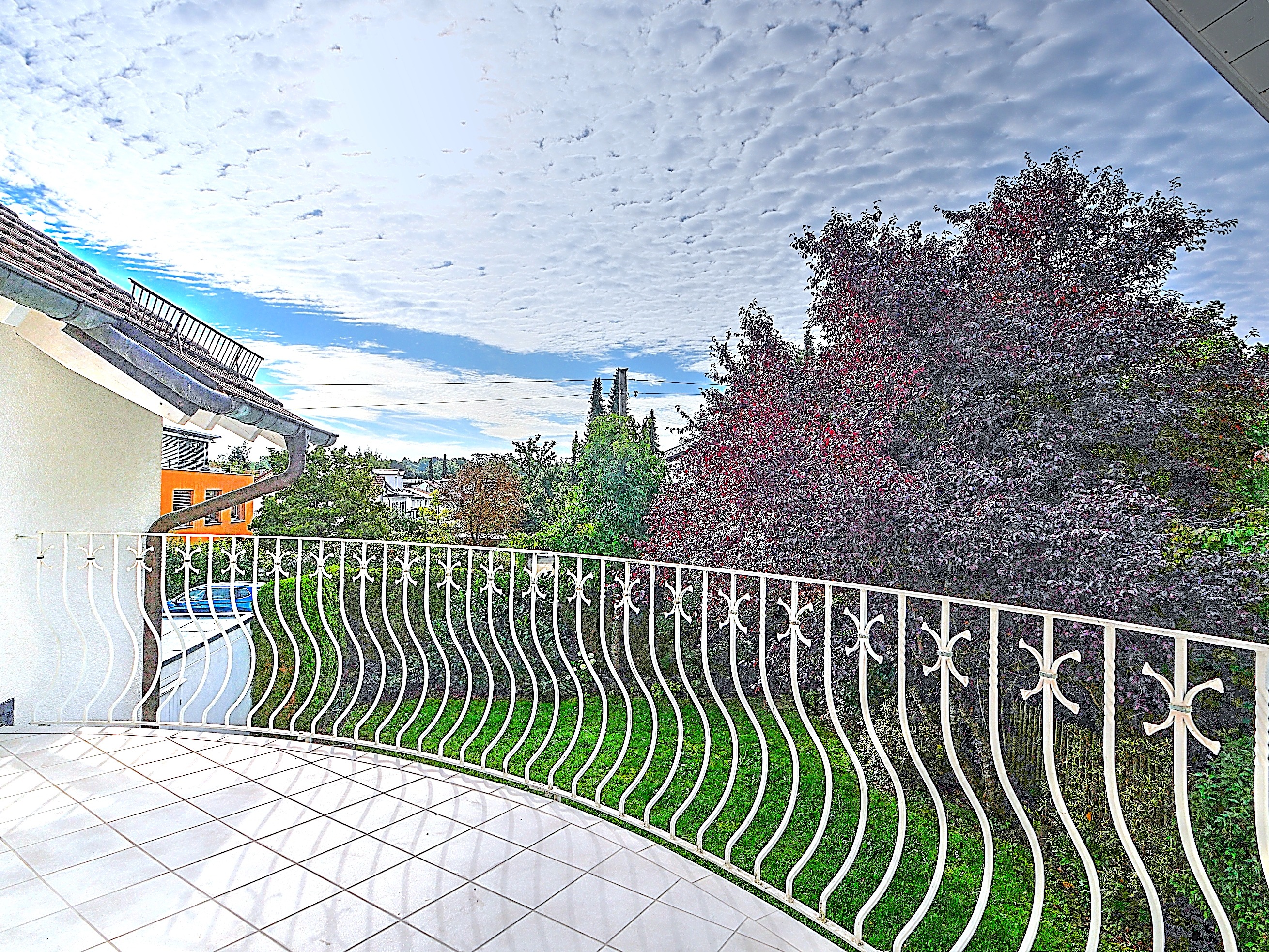 Im Obergeschoss erwarten Sie ein lichtdurchflutetes, großräumiges Zimmer mit offenem Sichtdachstuhl, abgehängter Decke und stilvollen Halogenspots. Von hier aus haben Sie Zugang zu einem Balkon mit herrlichem Ausblick. Zusätzlich gibt es ein weiteres Zimmer mit praktischem Einbauschrank und einem kleinen Balkon. Das helle Badezimmer verfügt über Badewanne, Bidet, separate Dusche und Fenster und sorgt für komfortables Wohnen.