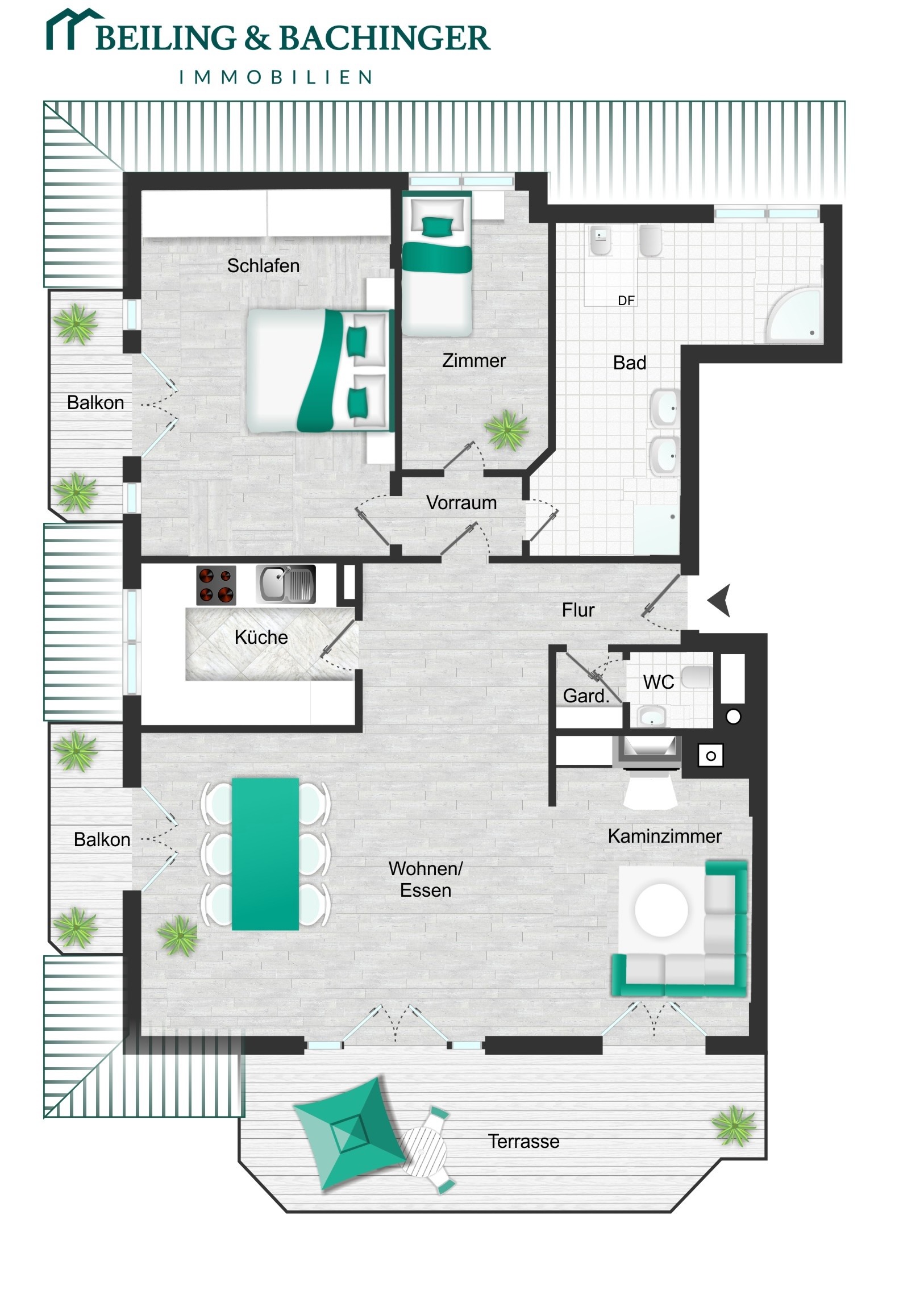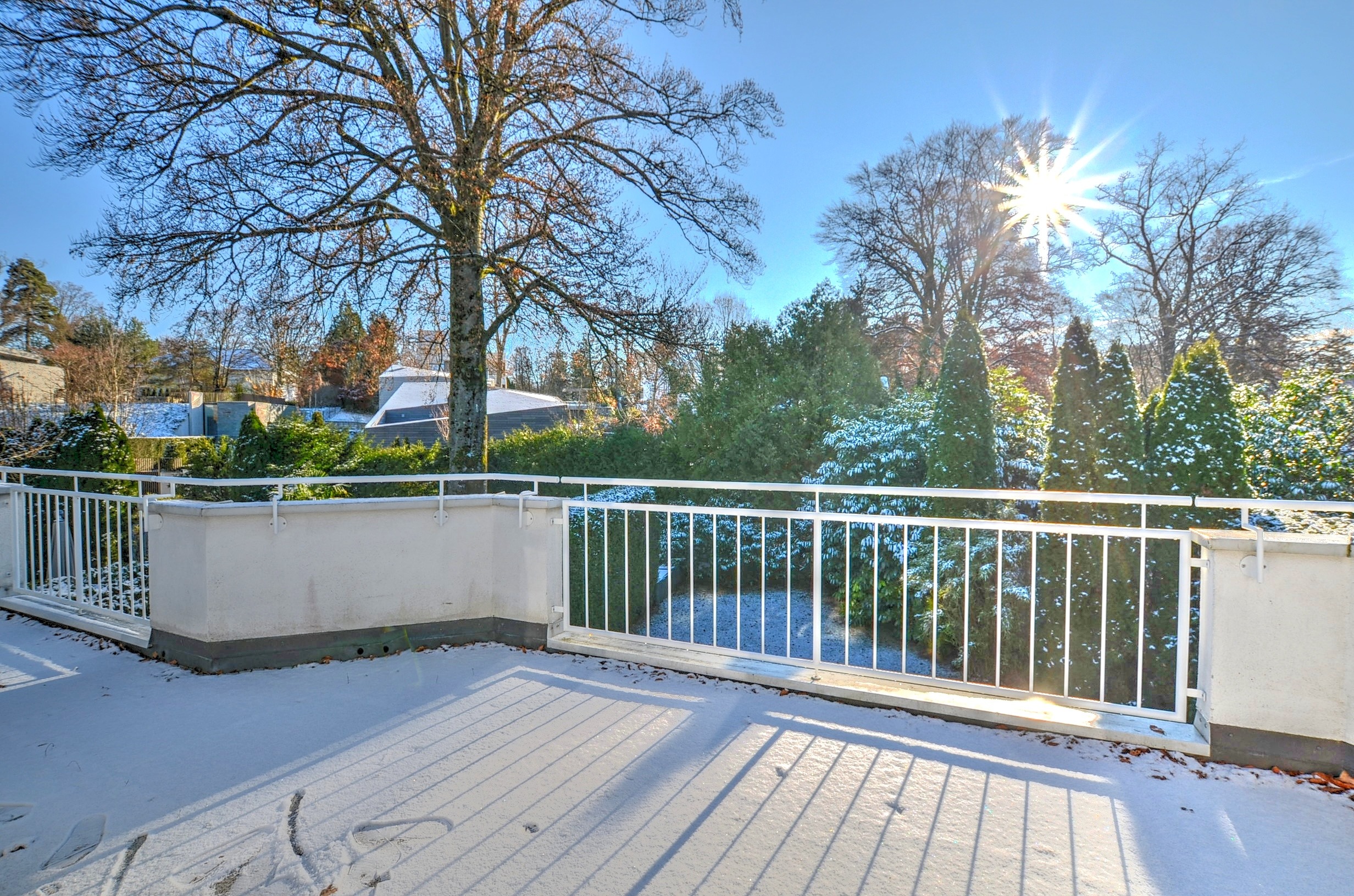 Der Wohnbereich ist offen gestaltet und lädt mit seinem schönen Kamin zu entspannenden Stunden ein. Die Küche ist durch eine Tür dezent integriert und dennoch gut zugänglich. Zwei große Terrassentüren führen auf die sonnige, weitläufige Dachterrasse mit Südausrichtung, von der aus sich ein idyllischer Blick ins Grüne und auf alte, eingewachsene Bäume eröffnet – ein absolut ruhiges und privates Wohngefühl.