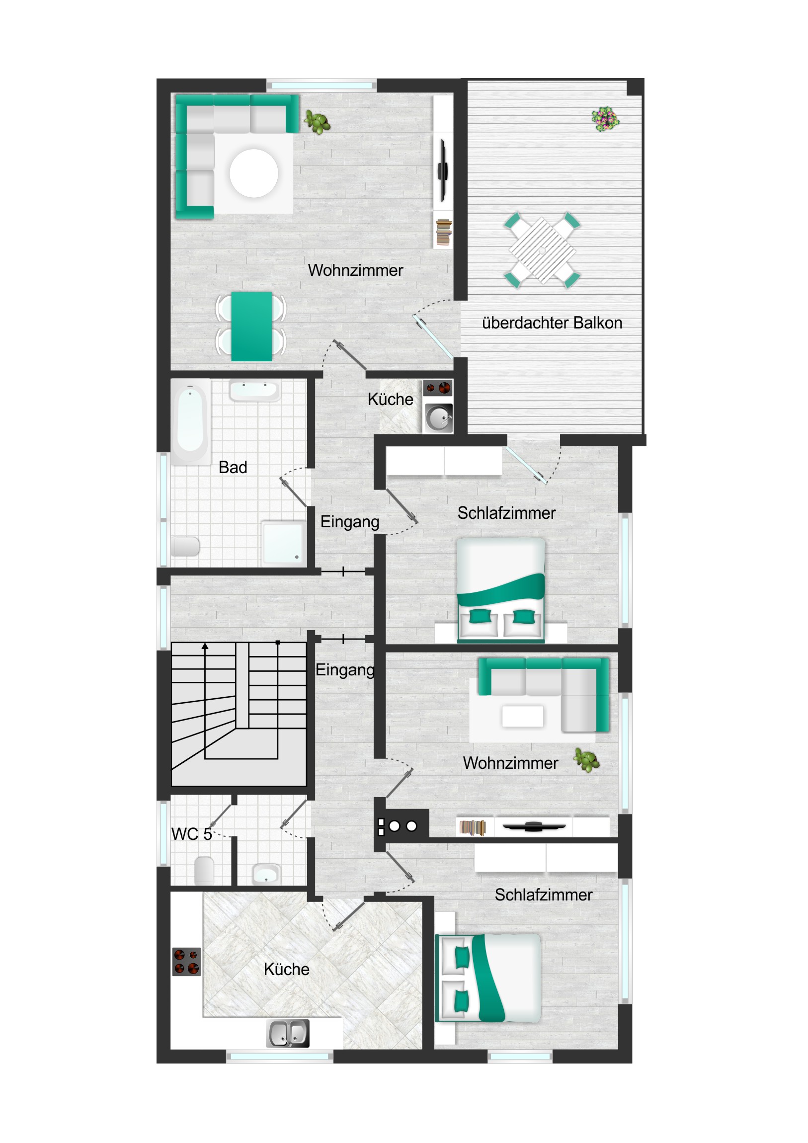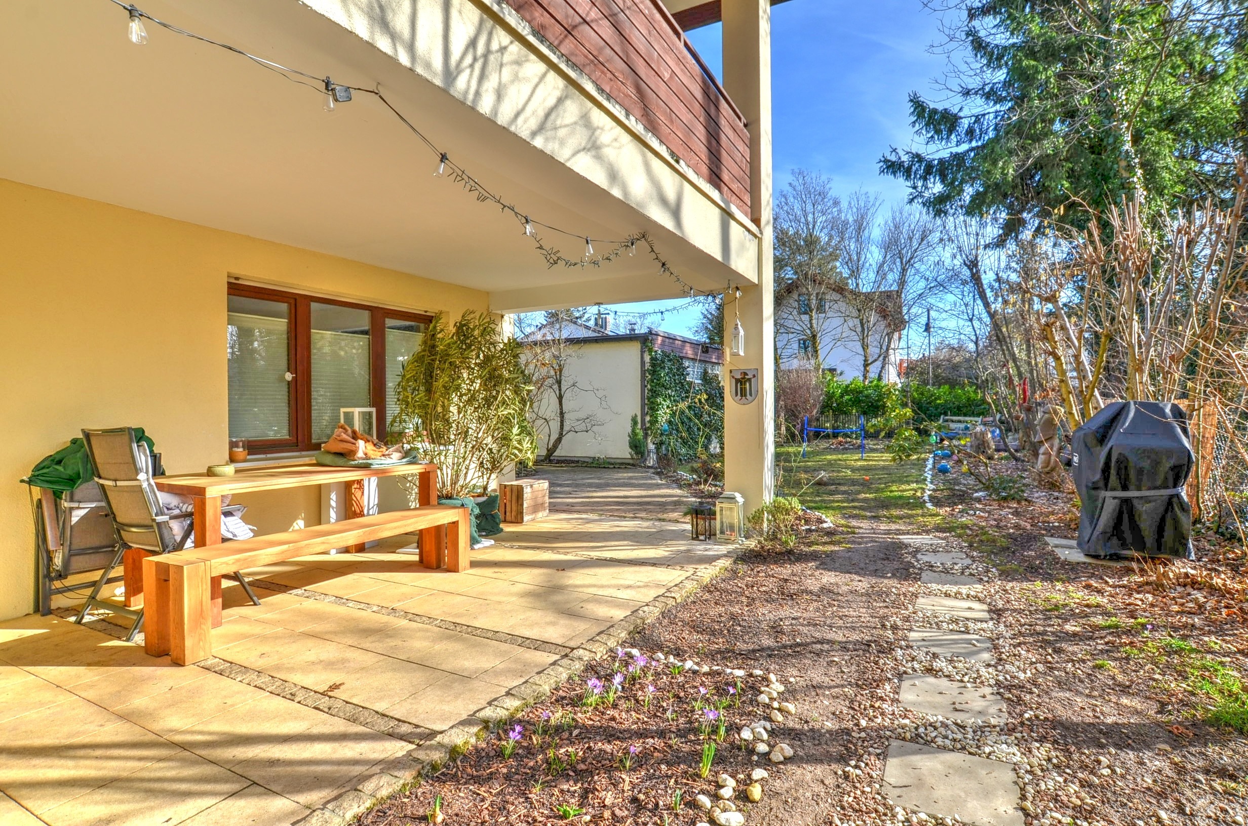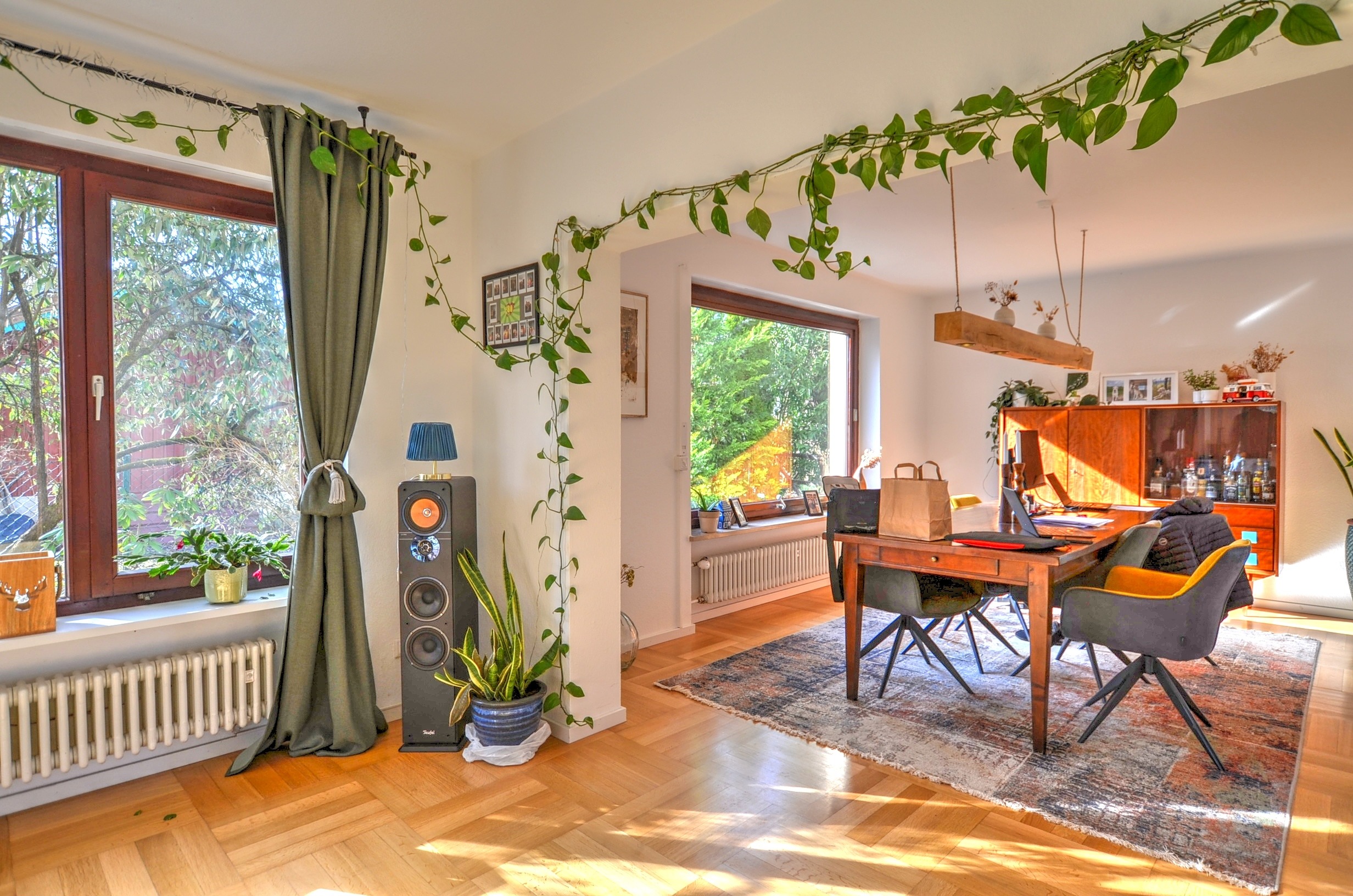 Das Haus umfasst derzeit insgesamt drei Wohneinheiten. Im Erdgeschoss befindet sich eine großzügige Wohnung mit direktem Zugang zum Garten, der den Bewohnern einen hohen Wohn- und Freizeitwert bietet. Im Obergeschoss befinden sich derzeit zwei weitere Wohnungen, von denen eine über eine große, sonnige Loggia in Südausrichtung verfügt. Die beiden Wohnungen im ersten Obergeschoss bieten das Potenzial für eine unkomplizierte Zusammenlegung zu einer großzügigen Viereinhalbzimmerwohnung mit Südloggia zur Eigennutzung ab dem 01.06.2026.